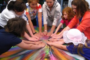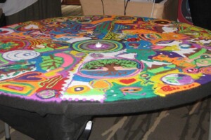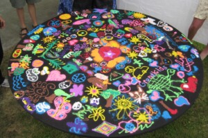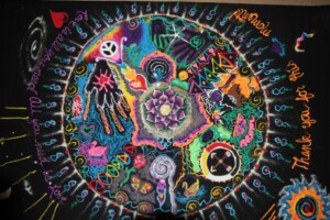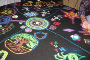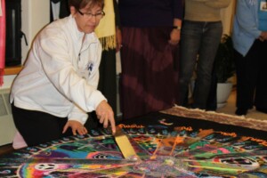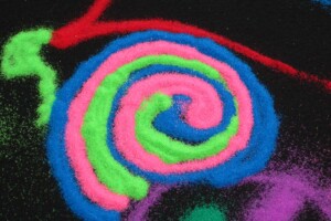 The Sand Mandala is a tradition involving the creation and destruction of mandalas made from colored sand. Historically, the mandala was not created with natural, dyed sand, but granules of crushed colored stone. In modern times, plain white stones are ground down and dyed with opaque inks to achieve the same effect. It is common that a team of Tibetan Buddhist monks will work together on the project, creating one section of the diagram at a time, working from the center outwards.